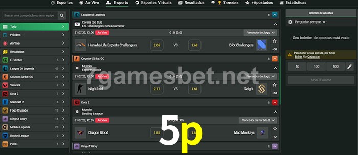 O 5p oferece uma grande seleção de opções de apostas em e-sports com probabilidades competitivas